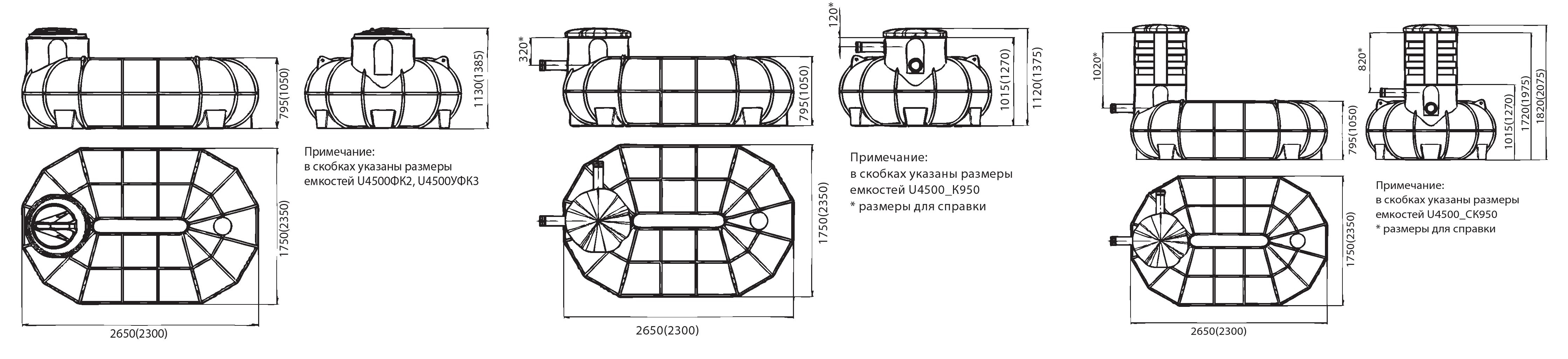 Емкости U2000ФК2® объемом 2000 л и U4500ФК2® объемом 4500 л предназначены для стационарного наземного хранения жидкостей. Емкости комплектуются крышками с дыхательным клапаном, диаметр отверстия в люке 380 мм. Возможна установка фильтра заливной горловины. Для перемещения пустой емкости краном в ее верхней части предусмотрены четыре проушины. Емкости U2000_К590® объемом 2000 л и U4500_К590® объемом 4500л неглубокого залегания предназначены для подземного накопления и хранения воды в т.ч. дождевой. Емкости комплектуются крышками в виде декоративного камня, диаметр отверстия в люке 590 мм. Глубина залегания входной трубы от 120 до 320 мм. |