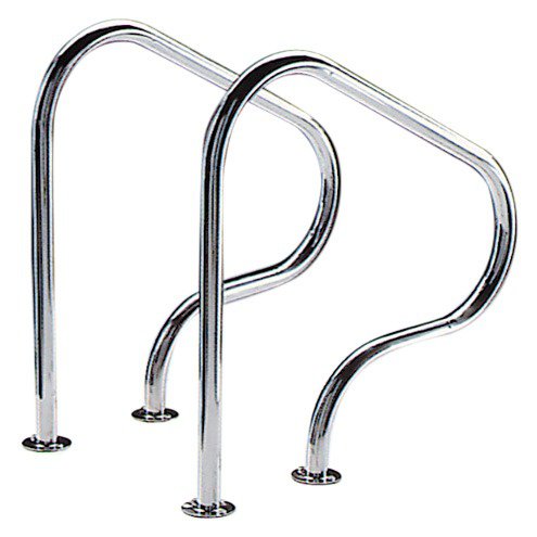 Из полированных труб из нержавеющей стали AISI-316 ∅ 43 мм. Поручни поставляются парой, комплектно с фиксирующими пластинами, уплотнениями, шурупами и дюбелями