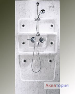 Практичная стена и секция, которая сочетает в себе все необходимые функции в одном месте. Сделана из вакуумно-формованного специального пластика. По-ставляется с эксклюзивным смесителем с термостатом, душем, который регули-руется от мягкого душа до интенсивного массажа, регулятором по высоте, полоч-ками для банных принадлежностей и шестью форсунками для расслабляющего массажа.