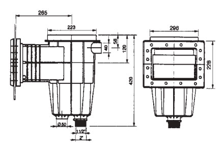 Рекомендуемый поток воды 5 м3/ч. Поток воды регулируется затвором скиммера. Нижний патрубок: внутреннее соединение 1 1/2’’, внешнее соединение 2’’. Дренажный патрубок ø 50. Дополнительный перелив ø 40. Корзина скиммера крепится с помощью штыковой муфты.