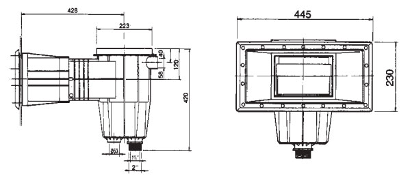 Рекомендуемый поток воды 5 м3/ч. Поток воды регулируется затвором скиммера. Нижний патрубок: внутреннее соединение 1 1/2’’, внешнее соединение 2’’. Дренажный патрубок ø 50. Дополнительный перелив ø 40. Корзина скиммера крепится с помощью штыковой муфты.