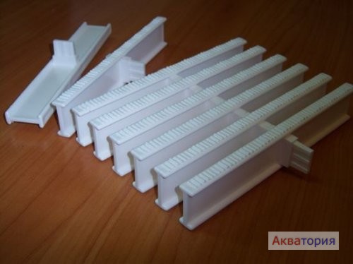 Нужная длина набирается из модулей, которые вставляются один в другой. Замок расположен в центре, что придает гибкость соединению и позволяет применять решетки как для прямых участков, так и для изгибов, а также гасить расширение, вызванное тепловым воздействием.