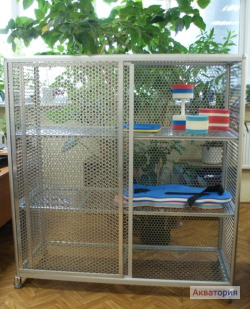 Стеллаж передвижной закрывающийся алюминиевый для хранения плавательных принадлежностей.