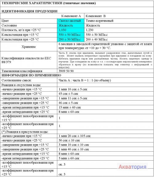 ТЕХНИЧЕСКИЕ ХАРАКТЕРИСТИКИ представляет собой двухкомпонентную полиуретановую пену без содержания галогенов, состоящую из:
