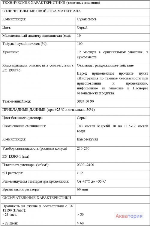 ОБЛАСТЬ ПРИМЕНЕНИЯ Точная анкеровка (подливка) оборудования и металлических конструкций. Некоторые примеры применения - Анкеровка металлических конструкций. - Анкеровка машинного оборудования путём заливки под основу - Заполнение жёстких швов между элементами из бетона и сборного бетона. ТЕХНИЧЕСКИЕ ХАРАКТЕРИСТИКИ Mapefill 10 - готовый к применению материал в виде сухой бетонной смеси для анкеровки на основе высокопрочного цемента, фракционированных заполнителей и специальных добавок с расширяющими агентами, изготовленный в соответствии с формулой, разработанной в исследовательских лабораториях MAPEI. При смешивании с водой Mapefill 10 становится очень текучей бетонной смесью без расслоения, которая способна заполнять даже сложные отверстия. Максимальная крупность заполнителя составляет 10 мм. Предназначена для анкеровки (подливки) оборудования при зазоре от 40 до 100 мм.