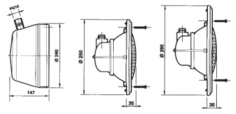 Из нерж. стали AISI-316, в комплекте с нишей, кабелем 2,5 м и лампой 300 Вт / 12 В. Накладка крепится к нише с помощью винтов.