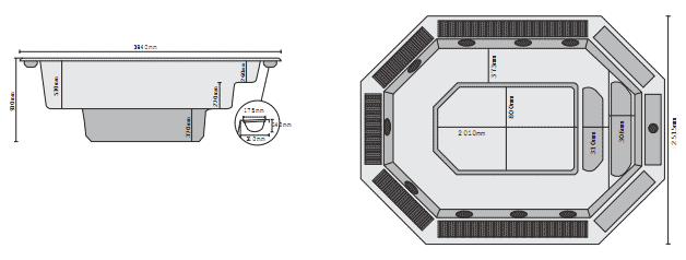 Гидромассажный бассейн укомплектован осветительным оборудованием, трансформатором, трубопроводом, дренажом, обратными форсунками, гидромассажными форсунками, воздушными форсунками и воздушной камерой. Поставляется с регулируемым установочным суппортом.