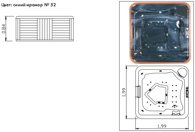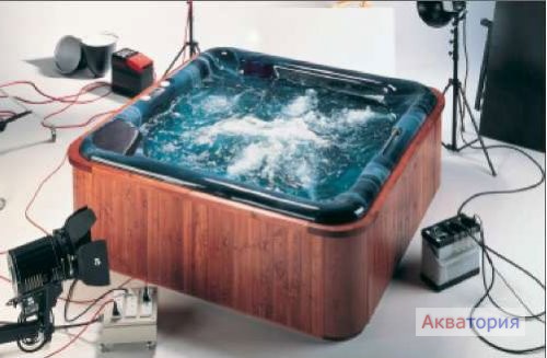 Меблированный гидромассажный бассейн. Облицовка из красной сосны. В комплекте: подголовники, дренаж, фильтрационная форсунка, гидромассажные форсунки, воздушные форсунки, форсунки Venturi, панель управления, позволяющая регулировать температуру воды, два пневматических пускателя, светильник, шкаф управления, массажный насос 1,5 кВт, компрессор 1,1 кВт, фильтрационный насос 0,65 кВт, электронагреватель 2 кВт, полиэстеровый картриджный фильтр с площадью фильтрации 2,3 м2.