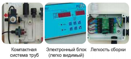 Для измерения и контроля уровня рН и концентрации хлора (400x500) РС95 Измерительный прибор; самоочищающийся амперометрический элемент (Р(-Си); датчик измерения рН; Система самокалибровки и контроль эффективности датчиков (рН); фильтр (промываемый при загрязнении); буферный раствор и комплект DPD |
