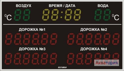 Назначение: Отображение информации при проведении соревнований по плаванию в закрытых бассейнах на 4 дорожки. |