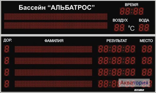 Назначение: Отображение информации при проведении соревнований по плаванию республиканского значения в закрытых бассейнах от 2-х до 10-ти дорожек. |