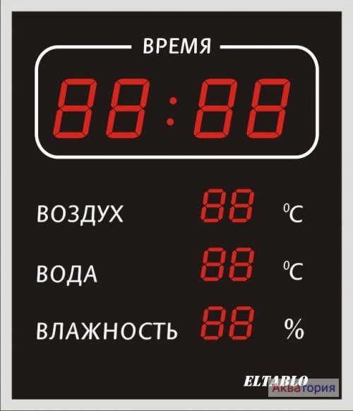 Назначение. Табло отображает: - Время / Дата (по очереди), - Температуру Воздуха, температуру Воды, относительную влажность воздуха. Автоматическое измерение. |
