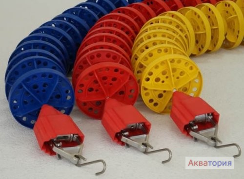 Завод выпустило разделителльные дорожки диаметром волногасителя 150 мм. Дорожки предназначены для проведения соревнований по плаванию. Разделители дорожек протягиваются по всей длине бассейна и закрепляются на обеих торцевых стенках бассейна, для этого в них должны быть вмонтированы анкерные крепления.