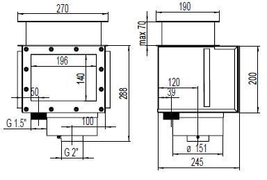 Монтируется в стену бассейна. Подсоединение к фильтру - внутренняя резьба 2’’, к аварийному переливу - наружная резьба 1 1/2".