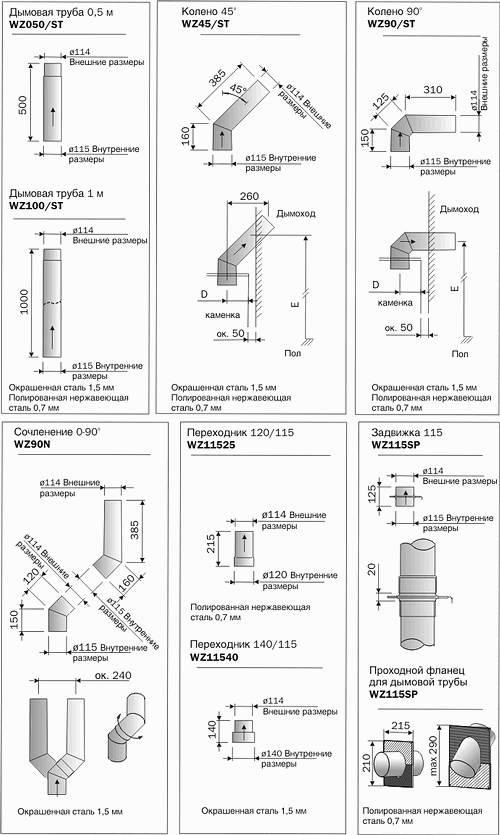 Для всех дровяных печей предлагаются дымовые трубы и колена, изготовленные из окрашенной или из нержавеющей стали.
