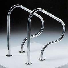 Из полированных труб из нержавеющей стали AISI-304 ∅ 43 мм. Поручни поставляются парой, комплектно с фиксирующими пластинами, уплотнениями, шурупами и дюбелями