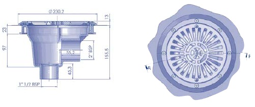 Изготовлен из ABSпластика. Боковое подсоединение 2” и донное подсоединение 11/2” .