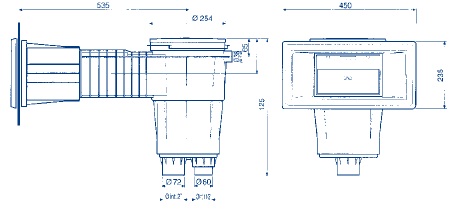Патрубки подсоединения 1 1/2” внутренний – 2” наружный. Также поставляется скиммер с внутренним подсоединением ∅ 50 мм. Подсоединение перелива ∅ 40 мм