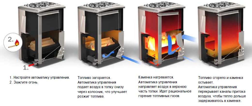 Запатентованная автоматическая система управления каменки GreenFlame направляет необходимый для горения воздух в нужное место в нужное время. Дерево горит дольше, выделяет меньше вредных веществ, а эффективность сжигания поддерживается на максимальном уровне. Стенки топки охлаждаются поступающим в зону горения воздухом, что продлевает срок службы каменки GreenFlame.