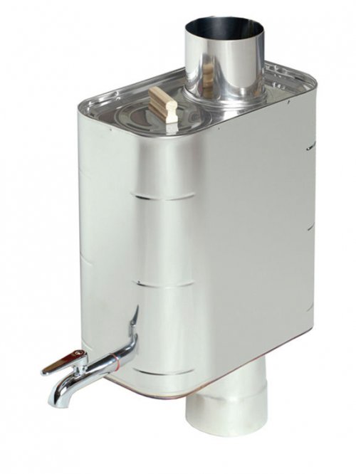 Резервуар для воды устанавливаемой на трубу модели (22 л) монтируется прямо на каменку. вода быстро нагревается, поскольку проходящая через резервуар труба