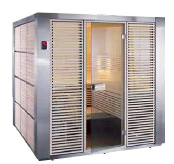 Передняя стена имеет стеклянные окна. Решетки, установленные снаружи на окнах, подчеркивают стиль внутреннего интерьера сауны. Рама основания с металлическим покрытием и регулируемые ножки защищают стены и остальные элементы сауны от влаги, испаряющейся с пола.