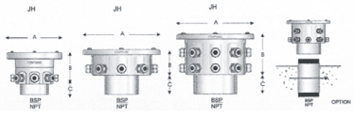 Рассчитаны на вывод от 1 до 24 кабелей. Используются уплотнения кабелей для двух типов диаметров. Закладные детали выполненные из бронзы серии Stub-Ups имеют PG16 и PG21. Уплотнение PG16 рассчитано на кабель диаметром до 9 мм, тип PG21 рассчитан на кабель диаметром от 9 до 15 мм. Кабельные выводы из нержавеющей стали комплектуются муфтами для кабеля диаметром 7-10 мм и 8-13 мм. |
