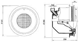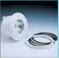 Светильник изготовлен из белого пластика, поставляется в комплекте с нишей, эластичными прокладками, фланцами, винтами, накладным кольцом и лампой 300 Вт.
