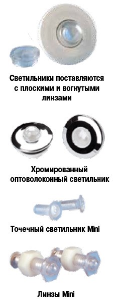 Весь ряд оптоволоконных светильников изготавливается из ABS-пластика, предусматривает легкую установку с помощью закладываемых в стену или просто склеиванием. Поставляются в двух исполнениях: с широким углом освещения и плоские, больше всего используемые в СПА и небольших бассейнах. С этими линзами сильно облегчается установка и отделка.. Также светильники Astralpool оснащены белыми или хромированными ободками, имеют стандартные соединения. М одели светильников различны для разных типов бассейнов: бетонных, из стекловолокна, акриловых и с отделкой плёнкой.