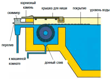Подводная ниша с валом сматывающего устройства должна быть отделена от основного бассейна небольшой бетонной перегородкой во время строительства или позднее перегородкой из ПВХ.