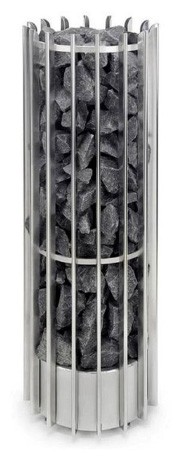 Печь по новой технологии, сочетающая в себе стильный дизайн и традиции изготовления печей для русской бани. 100 килограммов камней дает мощное, но одновременно мягкое, в сравнении со сталью, тепло. Любителям попариться всласть печь подарит такое количество пара, которое они могут только пожелать. Новая продуманная конструкция печи распределяет температуру в парной более симметрично, так как в отличие от металла, камень излучает тепло более симметрично. Плескать воду на камни вдвойне приятней, т.к. можно плескать как сверху, так и сбоку. Печь имеет нержавеющий матовый стальной корпус круглой формы, дополнительные ограждения из стекла или талькохлорита, минимальные безопасные расстояния (6 см.). Вы можете по желанию «врезать» печь в полок, либо просто установить её в центре или углу парной.