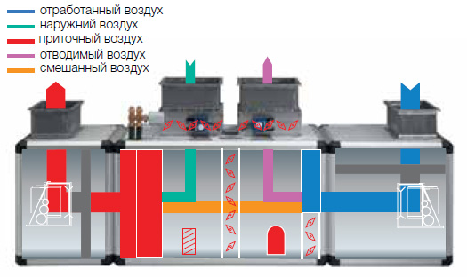 Потери тепла c уходящим воздухом компенсируются с помощью интегрированного в прибор водяного калорифера, подключенного к системе отопления здания. При необходимости, в систему можно встроить дополнительный водяной калорифер большей мощности или электрические тэны.