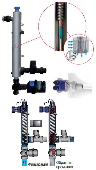 Обратная промывка осуществляется подачей воздуха из компрессора в сетчатый фильтр. Теплообменник подключается к