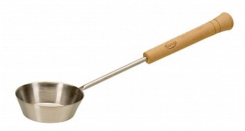 Черпак для бани из нержавеющей стали (немного матирован, броширован). Данная обработка предает неординарный "матовый" внешний вид, а так же носит эстетический характер: на нем не видно ни капель, ни разводов после использования. Анатомическая деревянная ручка позволяет удобно держать черпак в руке.