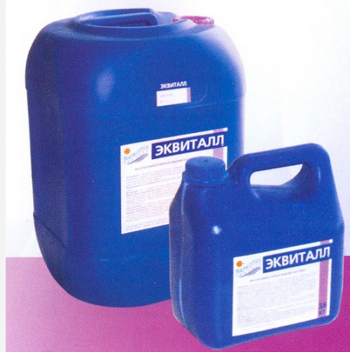 Для бассейнов, оборудованных станциями электронного дозирования, рекомендуется жидкий "Эквиталл", расфасованный в тридцатилитровые канистры (товарный вес - 36 кг)