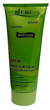 Крем массажный антицеллюлитный. Специальный крем для антицеллюлитного массажа помогает избавиться от застойных процессов в подкожной жировой ткани и предотвращает образование новых жировых отложений. Антицеллюлитный комплекс крема (кофеин, масляный экстракт красного перца, 5 эфирных масел, морские водоросли и экстрапон грейпфрута) улучшает кровообращение глубоких слоев кожи во время массажа, способствует интенсивному дренажу, выведению излишков воды из проблемных зон, делает кожу ровной и гладкой.