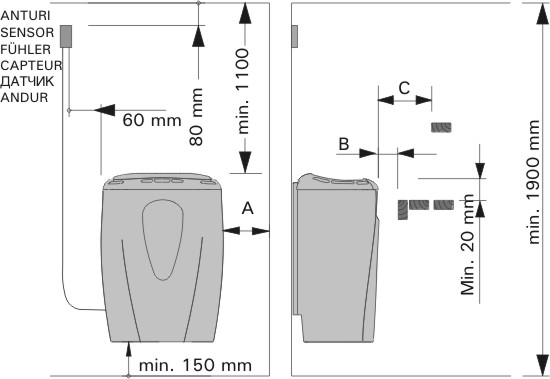 | Безопасное расстояние A до стены, мм | 35 | 40 | 70 |