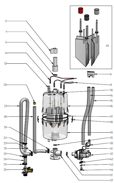 Паровой цилиндр снабжен электродами из нержавеющей стали, расположенными кольцом. Когда водопроводная вода поступает в цилиндр, электрический контур замыкается, т. к. водопроводная вода всегда обладает проводимостью. Производимый пар чистый и деминерализованный, т. к. водяные соли задерживаются в цилиндре.