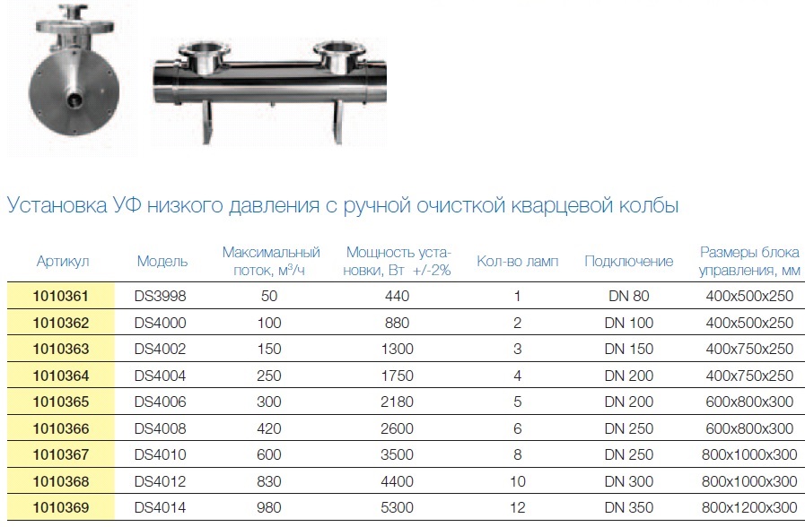 ■■Корпус изготовлен из нержавеющей стали AISI 316L ■■Доза UV-C излучения более 400 Вт/м2