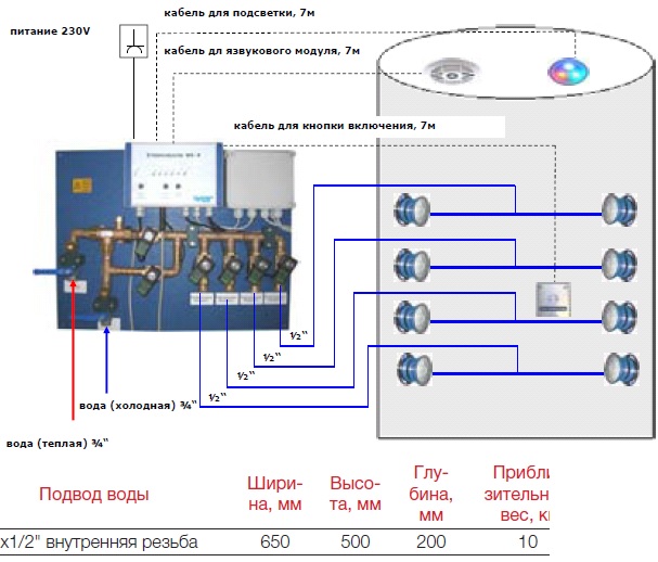 теплая вода, освещение становится красным и 4 пары форсунок начнут работу в обратном направ-