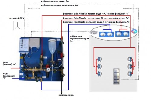 программа завершается прохладным Туманом и теплой струей из боковых форсунок. Освещение в душе меняется на голубовато-