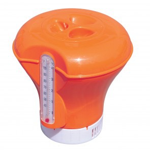 Плавающий дозатор с термометром. Регулирует интенсивность попадания дезинфицирующих веществ в воду бассейна Размер: диаметр 18.5 см Максимальный диаметр таблеток 7.6 см
