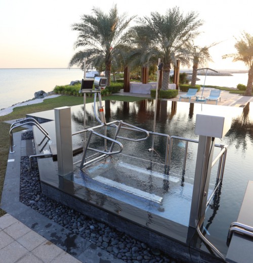 Для людей с ограниченными возможностями идеальным вариантом будет установленное в бассейн регулируемое дно с встроенной беговой дорожкой Pooltrack Professional. В этом случае человеку не нужно будет по лестнице заходить в бассейн, он сможет зайти на фальшпол, поднятый до уровня воды и опуститься на необходимую глубину вместе с фальшполом. Беговой полотно не выступает за уровень пола и не мешает.