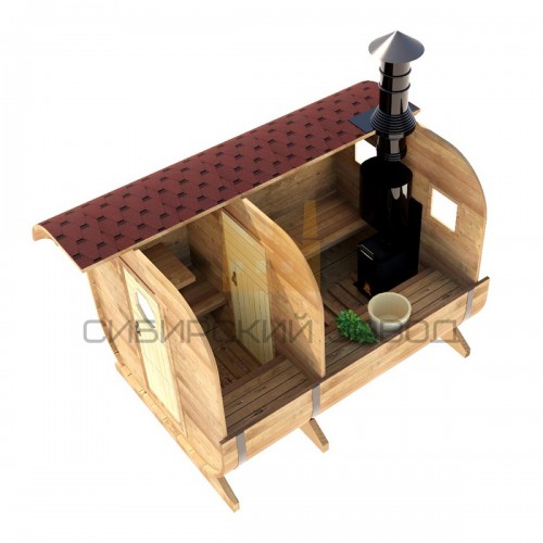 Кедровая баня в виде бочки может быть доработана и дополнена другими опциями по желанию покупателя.