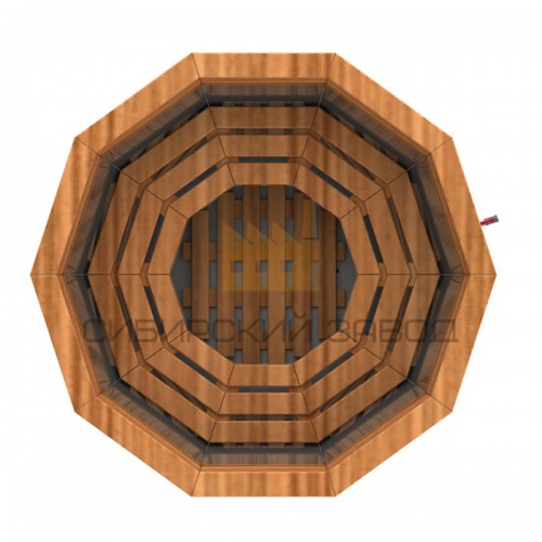 Модель с полной комплектацией: стальной корпус, деревянная обшивка, скамейки, подножник, лестница. Нет только подставки и дровяной печки, за счет чего сильно снижена стоимость. Данная модель чана рассчитана на встраивание в кирпичное или каменное основание, или подиум.