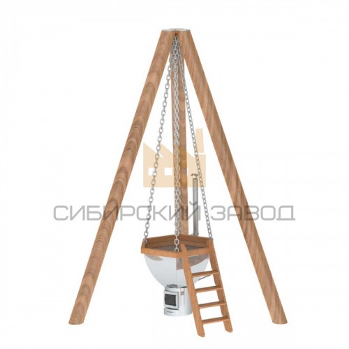 В комплектацию входят 3 больших бревна, высотой до 6 метров. Чан зафиксирован по принципу яхтенного такелажа, применяемого на морских судах и способного удерживать мачты в шторм. Это говорит о максимально надежном креплении банного чана к бревнам. Крепеж не ослабят ни сильные ветры, ни даже ураганы!