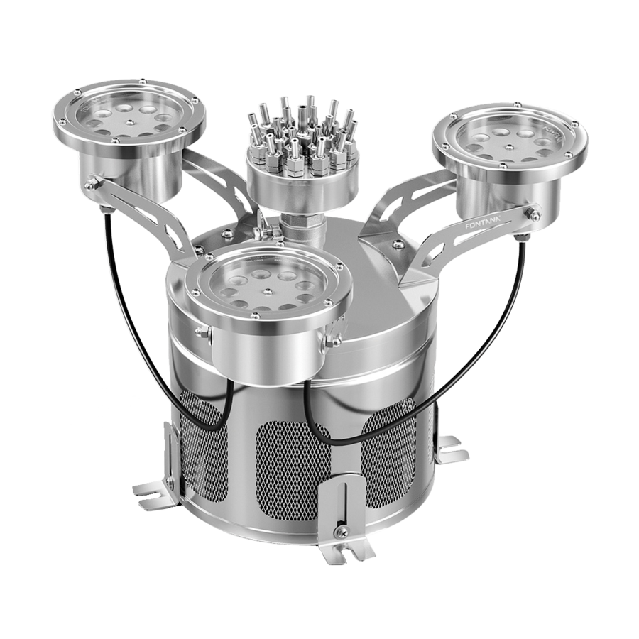 Фонтанный комплект из нержавеющей стали: насадка Fleur de Lis Adujstable; высота струи 2,5;м; светильники подводные UL416.RGB.PVM. 15Вт/12-24В - 3 шт.; насос погружной 300Вт/220В; регулируемые опоры, крепеж