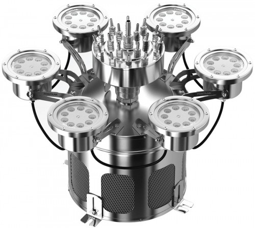 Фонтанный комплект из нержавеющей стали: насадка Fleur de Lis Adujstable; высота струи 4,0 м; светильники подводные UL416.RGB.PVM. 15Вт/12-24В - 6 шт.; насос погружной 900Вт/220В; регулируемые опоры, крепеж