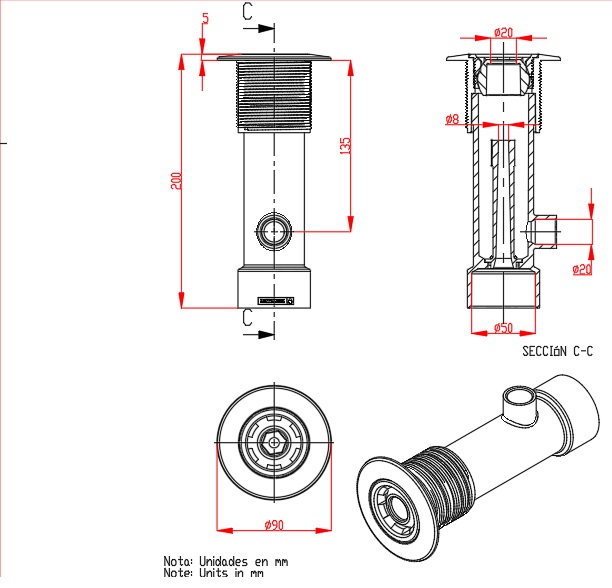 Труба для подключения к подаче воды диаметром 50 мм и труба для всасывания воздуха диаметром 20 мм..