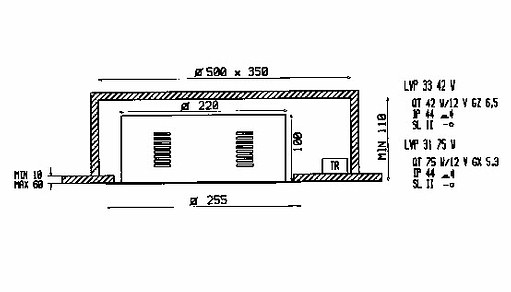 Проекторы серии LVP выпускаются следующих мощностей: 42, 75, 100 и 150 Вт, цвет - белый. Благодаря весьма малой глубине встраивания проектор легко установить как в потолке, так и в стене. Белую крышку проектора можно покрасить под тон стены/потолка.