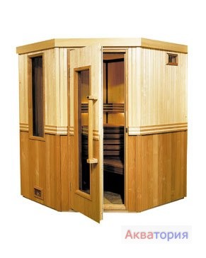 Стены и потолок обшиты внутри осиновой вагонкой. Отделка стен повторяется в дизайне спинок со скрытым освещением. Кабина, готовая к сборке, включает: изо-лированные стенные и потолочные секции, алюминиевую анодированную раму, арматуру для электрического кабеля, освещение, трансформатор, угловые и по-толочные рейки, вентиляционные окошки необходимые для сборки детали. Внеш-няя высота 203 см. Нагреватель для сауны можно выбрать